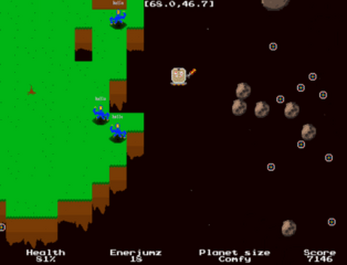 - Twin stick flying and shooting: harvest asteroids and blow up the red stuff.